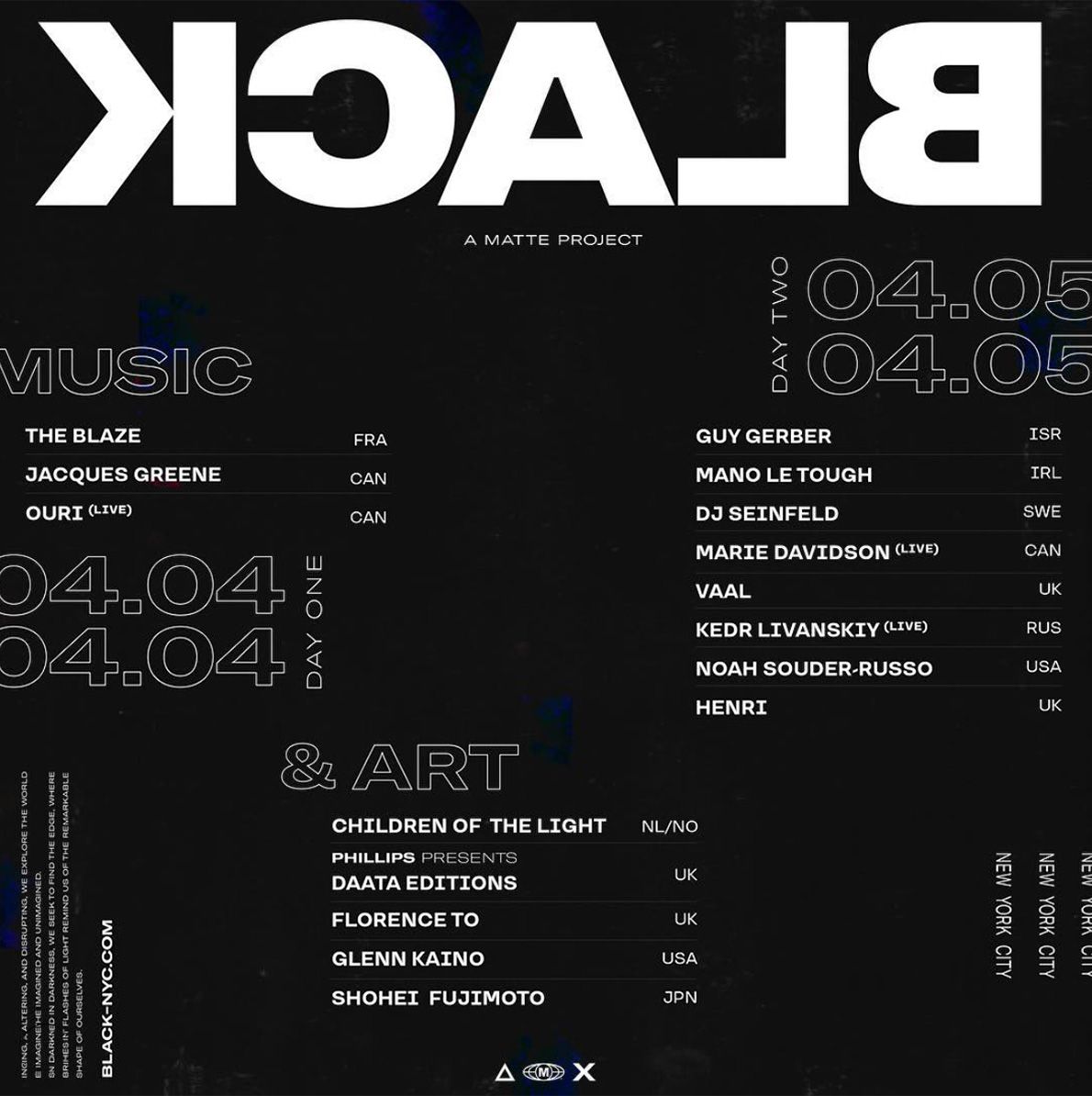 BLACK unified music, design, and contemporary art—transforming a space into an orchestration of form, sound, and culture. Performances by Guy Gerber, Mano Le Tough, DJ Seinfeld, Marie Davidson (LIVE), VaalKedr Livanskiy (LIVE), Noah Souder-Russo, Henri Bergmann, The Blaze, Jacques Greene, and Ouri (Live). Art instalations by Children of the Light, Phillips Presents: Daata Editions, Florence To, Glenn Kaino, Shohei Fujimoto.